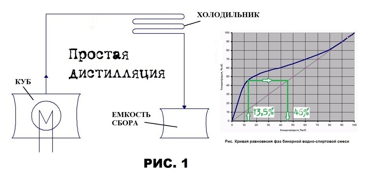 Как может быть джин дистиллятом, когда в составе указан ректификат? В статье Алексея Пятницких утверждается, что ректификат на примере джина может стать дистиллятом. Это довольно грубое ничем не обоснованное заблуждение. На самом деле это невозможно. На Рис. 1 показана схема простой дистилляции и кривая равновесия фаз, показывающая механизм получения дистиллята. При разовом испарении бражки, например, крепостью 13,5%об. на выходе после холодильника мы получим дистиллят крепостью примерно 46%об. Джиновую ароматику пока во внимание брать не будем, важен сам принцип перегонки и понимание что есть дистиллят, а что - ректификат. При нежном кипении без бурления в отборе можно получить продукт с максимально сохраненными конгенерами исходного продукта вина (бражки). По кривой равновесия фаз видно, что ступень разделения спирта и примесей всего одна. При таком способе разделение слабое, а так же наваривание дополнительных примесей минимальное. Из документов 18 века такой продукт называется "Сп