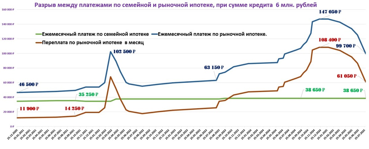 «Для среднестатистической семьи в Новосибирске ипотека остается по-прежнему недоступной, — констатирует эксперт. — Тем не менее, от максимального платежа по рыночной ипотеке, который пришёлся на середину декабря 2024 года, снижение составило 33%. Несмотря на то, что абсолютный разрыв ежемесячного платежа между семейной и льготной ипотекой снизился со 108 тыс. рублей до 61 тыс. рублей, платёж по «семейке» в 2,5 раза меньше».