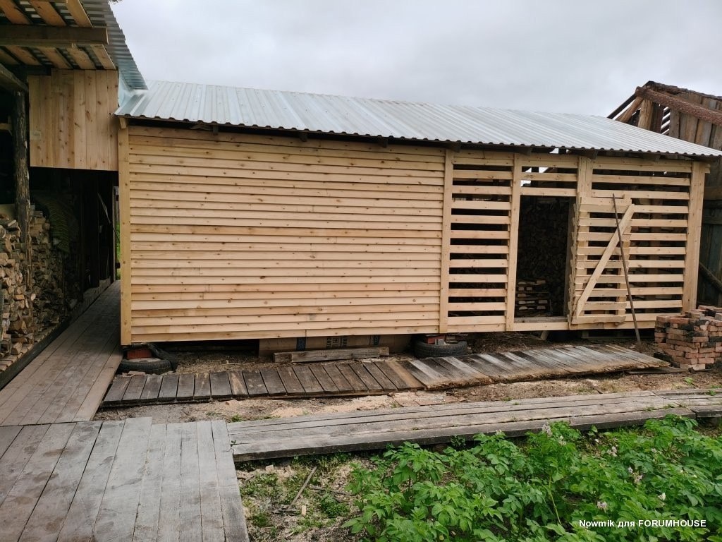 Каркасный дровянник-сарай 5х8 от подписчика FORUMHOUSE: - Было - стало. Сделали гараж-сарай-дровяник тёще. Делюсь идеей, как можно оформить эту тему. Правда, на уже готовом пришла мысль, что их местами надо было поменять... "Хорошая мысля приходит опосля". Осталась мелочь - добавить пол из поддонов или досок, конёк, но это уже потом, покрасить пропиткой. Главное, что под крышей. Общий размер 5х8 м, каркас установлен на бетонный колёсные чушки. Построили где-то за 4 дня, ну и мелочёвка дня 2. А так, в целом, неплохо получилось, прежний сарай стоял лет 20, сгнил именно на границе с землёй. А земля - чистый почти песок, поэтому даже подушки не делал. Как вам?
