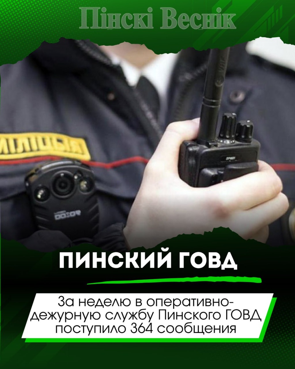 🤍В период с 21 по 27 июля в оперативно-дежурную службу Пинского ГОВД поступило 364 сообщения, из которых 46 касаются уголовного процесса, еще 142 - административных правонарушений, 15 - семейно-бытовых конфликтов и 69 - вопросов по линии ГАИ.