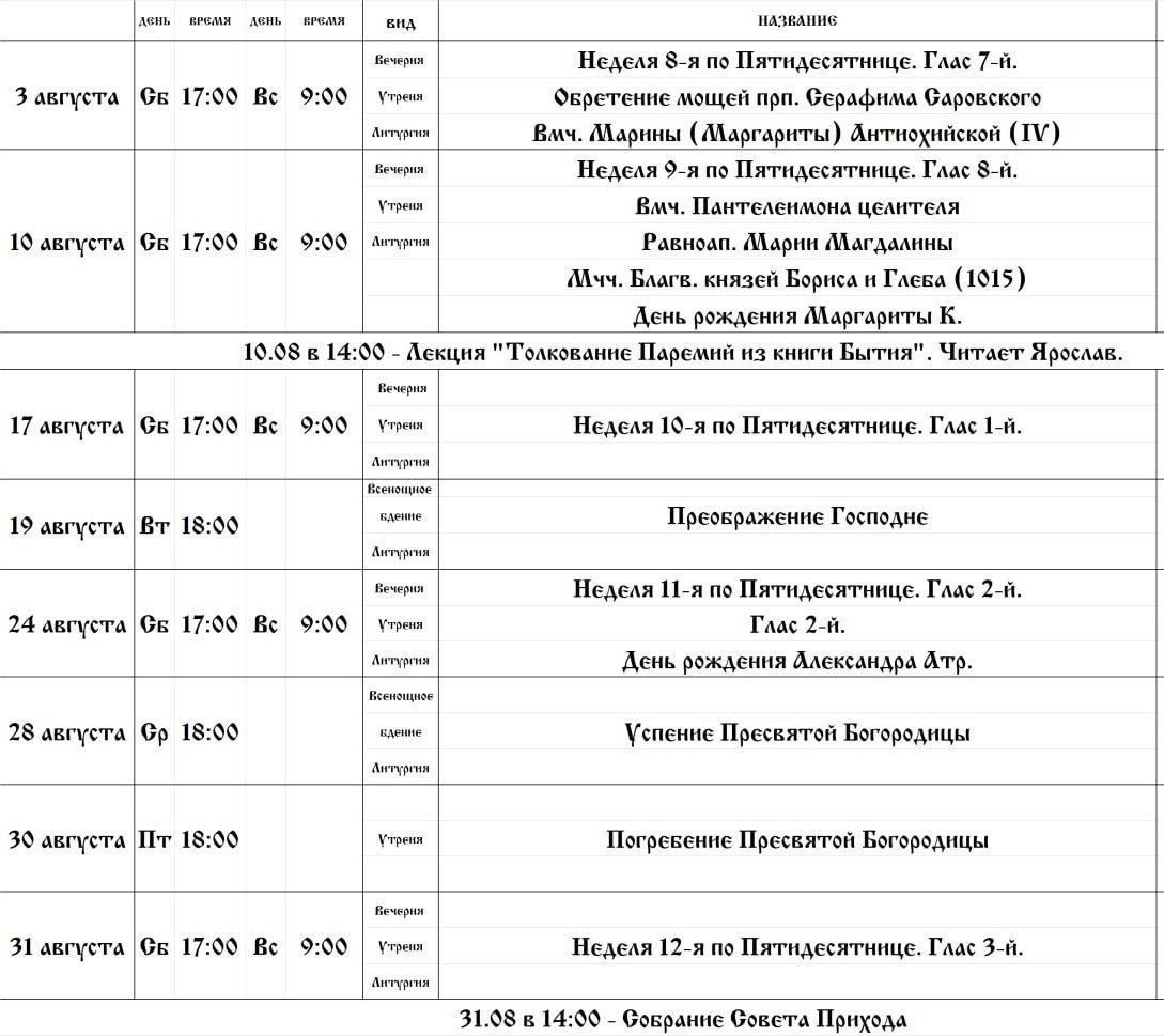 Расписание служб в АВГУСТЕ ‼️18 августа, Пн, 18:00 Преображение Господне 📺 Ссылка на видеотрансляцию ⬇️ Скачать тексты служб ❤️Пожертвовать просто! Открытый сбор в Тинькофф банке: https://www.tbank.ru/cf/9VbaUPisWhe или перевод по СБП: +79522677340 ✅ Канал Прихода св. Георгия. Подписаться!