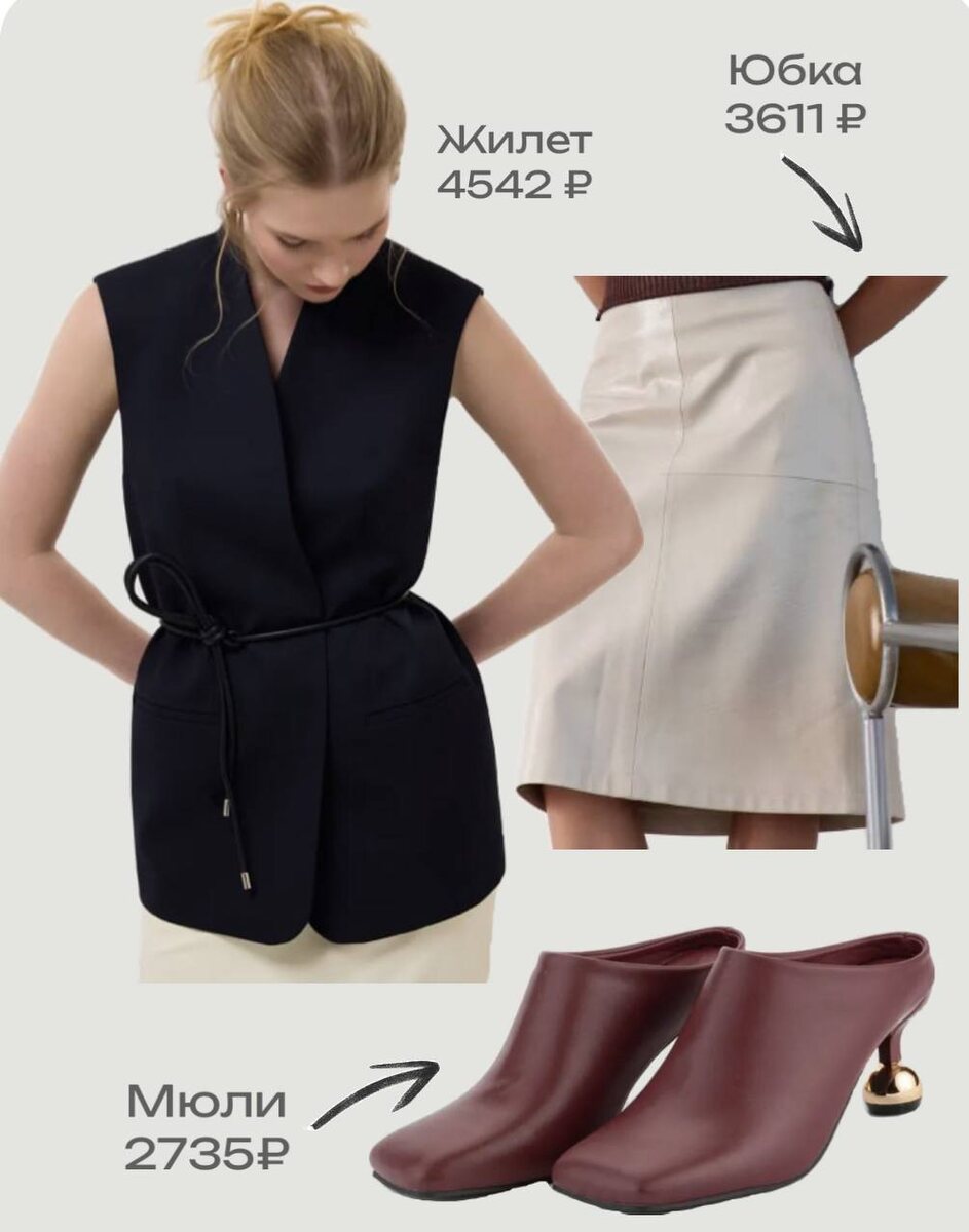 Начнем утро с красивого образа. Лежит в корзине 😍 Планирую носить осенью и возможно на 1 сентября тоже в нем. Тема ЧБ не отпускает меня Юбка, Жилет и Мюли