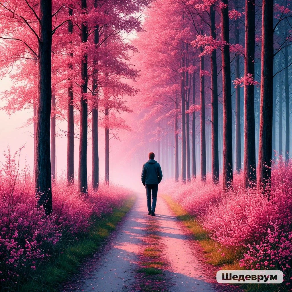 Представьте себе человека, гуляющего в лесу ранним утром. Солнце только начинает подниматься над горизонтом, окрашивая небо нежными оттенками розового цвета.