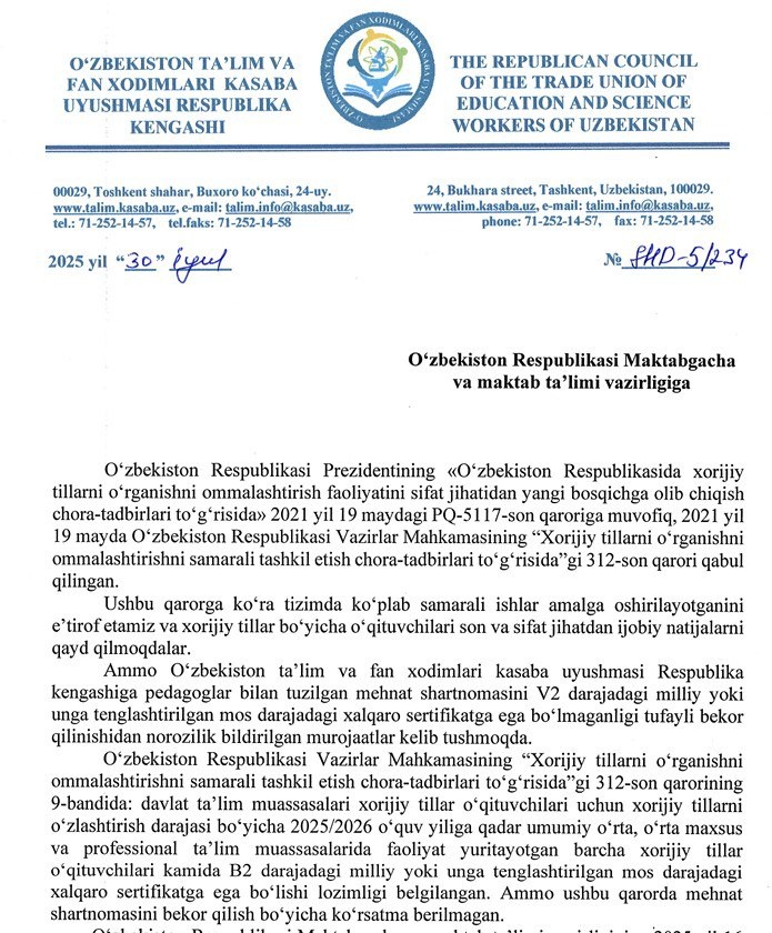 O‘zbekistonda xalqaro til sertifikati yo‘q o‘qituvchilarni ishdan bo‘shatmaslik so‘raldi O‘zbekiston ta’lim va fan xodimlari kasaba uyushmalari respublika kengashi Maktabgacha va maktab ta’limi vazirligiga taqdimnoma kiritdi. “Mehnat kodeksida aynan sertifikat yoki malaka tavsifiga qo‘shimcha talab tufayli mehnat shartnomasini bekor qilish talabi belgilanmagan”, deyiladi vazirlikka yuborilgan xatda. @daryolive