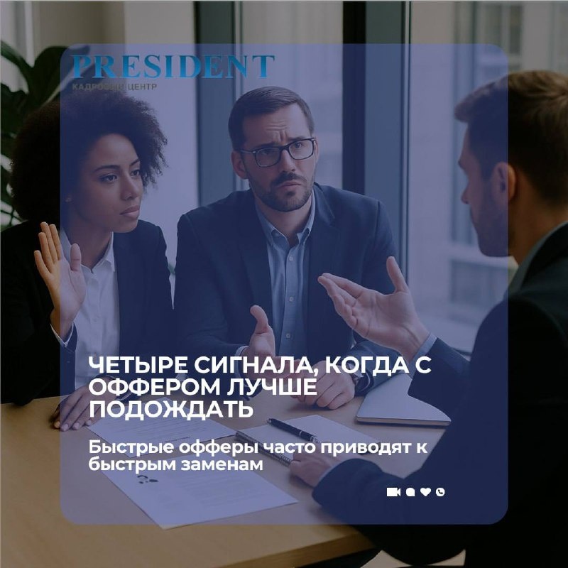 Советы работодателю: Не спешите с оффером, если… Кандидат производит отличное впечатление, идеально подходит по опыту и харизме — хочется сразу отправить оффер. Но в некоторых случаях лучше притормозить. И вот почему: 1️⃣Не проговорены ключевые ожидания Если вы не обсудили, что для кандидата важно — условия, развитие, стиль управления — вы рискуете разочаровать его уже на старте. А значит, потерять в первые месяцы. 2️⃣Не проверена мотивация Он говорит «интересно», но не может объяснить — почему именно ваша компания и эта роль? Это тревожный звоночек. Без внутренней мотивации оффер легко будет перебит. 3️⃣Есть расхождения между словами и фактами Кандидат говорит, что «вел проекты», но не называет ни одного примера. Или уходит от конкретики. Потратьте время на доп.проверку — это быстрее, чем замена через месяц. 4️⃣Отсутствует финальное согласование с командой Если будущий руководитель или ключевой коллега ещё не видел кандидата — не спешите. Оффер без согласования может подорвать вн
