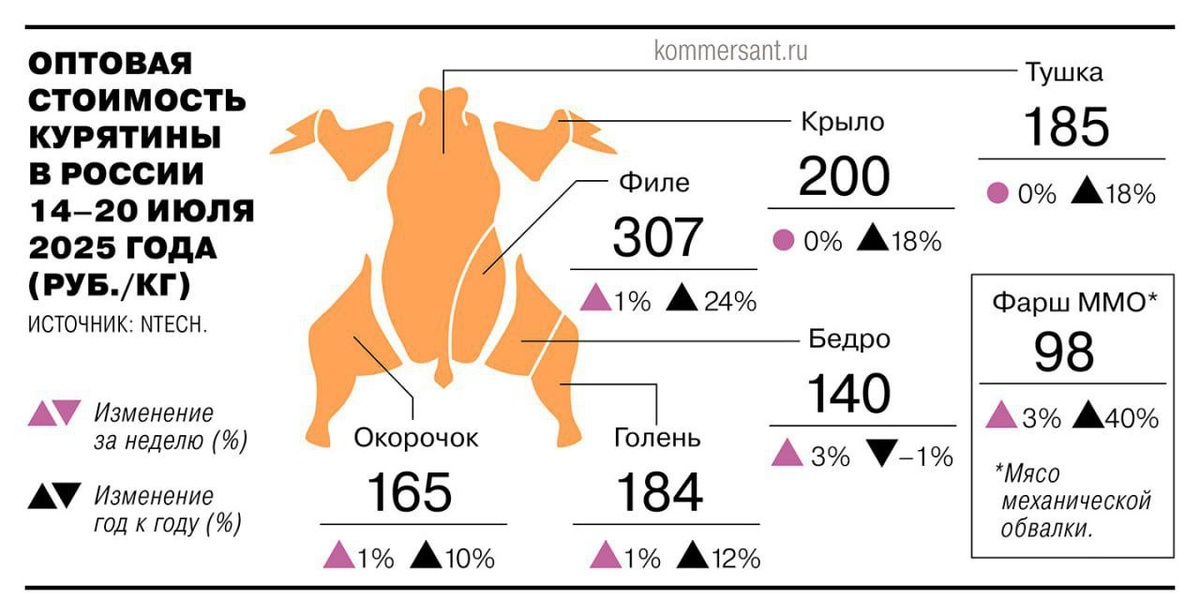 Курица больше не бюджетная. Средняя оптовая цена на курятину выросла на 18% за год. Особенно подорожал фарш механической обвалки — плюс 40%. Его используют в производстве сосисок, колбас и полуфабрикатов. Причины роста — высокий спрос: потребители переходят с дорогой свинины на курицу, а производители сталкиваются с увеличением себестоимости.
