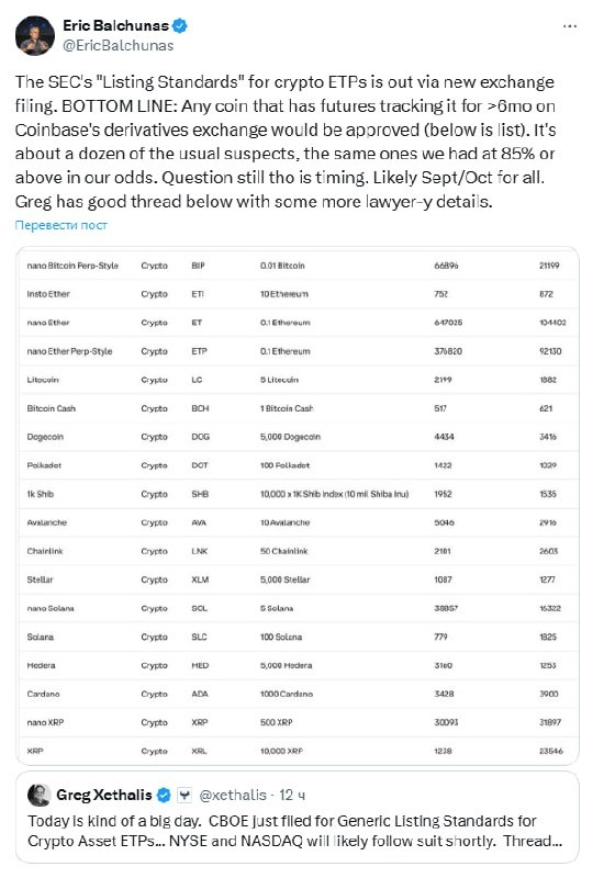 SEC опубликовала «Требования к листингу» для крипто-ETP через новую заявку биржи. СУТЬ: Любая монета, имеющая фьючерсы, отслеживающие её цену >6 месяцев на деривативной бирже Coinbase, будет одобрена (список ниже). Это примерно дюжина «обычных подозреваемых» — те же, что мы давали с вероятностью 85%+. Главный вопрос — сроки. Вероятно, все утвердят к сентябрю-октябрю.