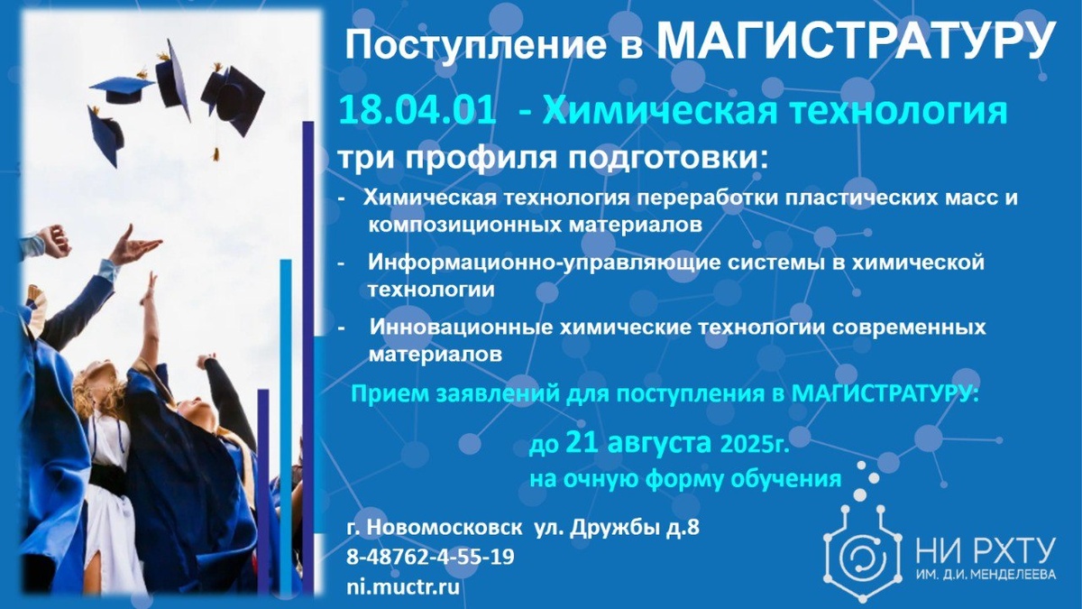 Новомосковский Институт РХТУ им. Д.И. Менделеева проводит прием документов от поступающих на 2025/2026 учебный год для обучения в магистратуре по направлению подготовки 18.04.01 Химическая технология. Обучение проводится по трем профилям подготовки: 📍Химическая технология переработки пластических масс и композиционных материалов 📍Информационно-управляющие системы в химической технологии 📍Инновационные химические технологии современных материалов ✅21 августа завершится прием документов для абитуриентов НИ РХТУ, поступающих на очную договорную форму обучения! ℹ По вопросам обращаться в приемную комиссию по тел. 8 (48762) 4-55-19, а также ▶ https://dzen.ru/id/665466924576313e327c958a 🛜 https://ni.muctr.ru #НИРХТУ #ПоступайПРАВИЛЬНО