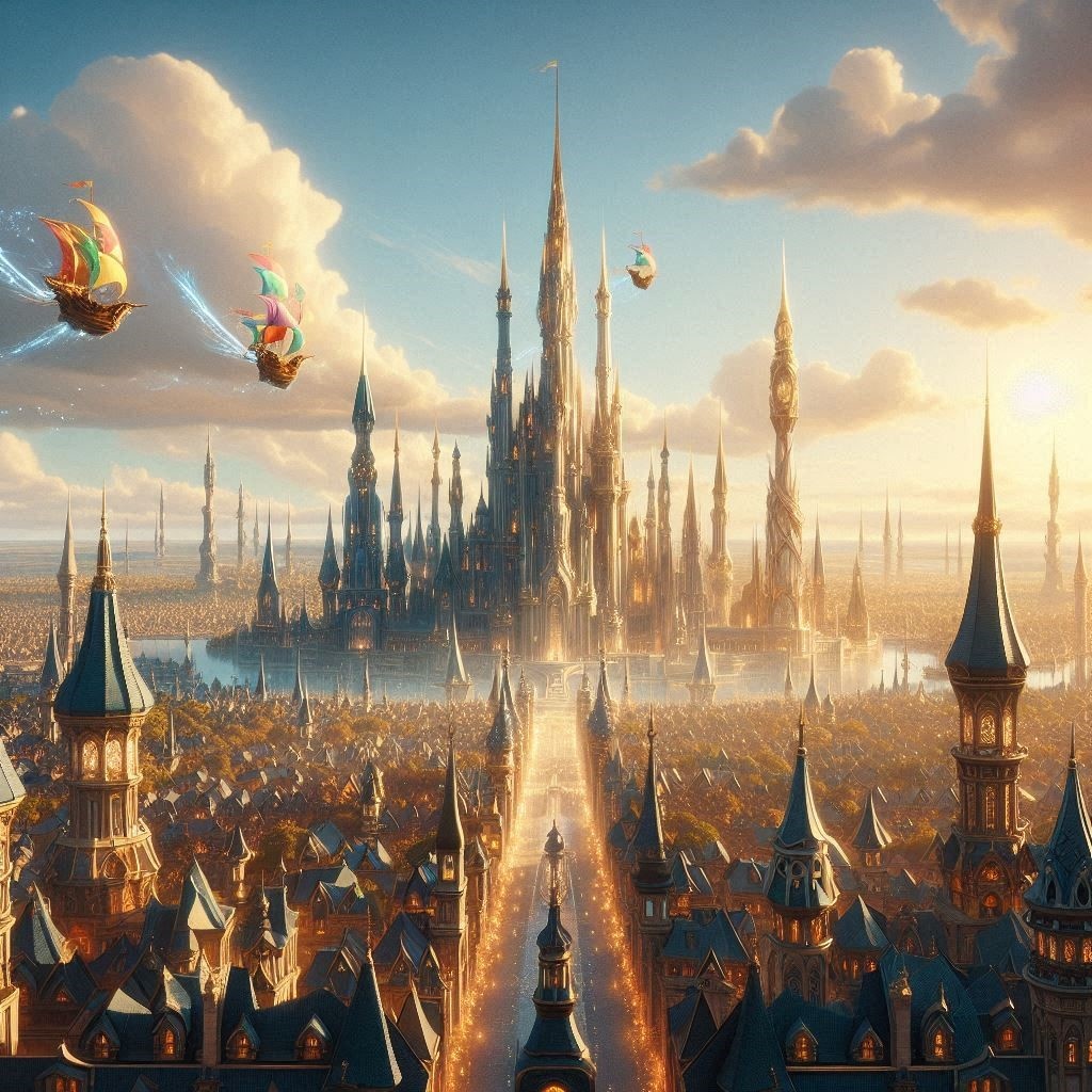 Рядом с ней волшебник, казалось, вел оживленную беседу с деревом, чьи листья излучали золотистое свечение. Чуть поодаль на площади уличные артисты жонглировали огненными шарами, вызывая восхищенные возгласы зрителей. В небольшом парке молодая эльфийка создавала изящные ледяные скульптуры прямо из воздуха. А над головой, как в сказочном сне, неспешно проплывали воздушные корабли с разноцветными парусами.