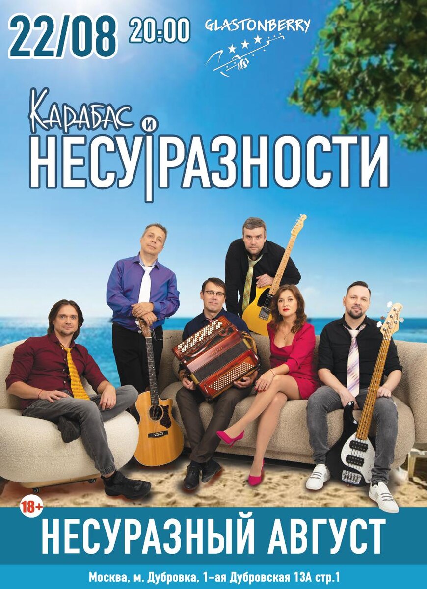 22 августа | Клуб GLASTONBERRY Билеты 2208.ticketscloud.org Мы приглашаем Вас весело отметить завершение летнего сезона в уютном месте. В программе прозвучит самое романтическое и самое хулиганское! Большой состав музыкантов! Стоимость билетов от 1000 руб 18+ Москва, ул. 1я Дубровская, д.13А, ст. 1 Есть парковка #несуразности #концертымосква #лето