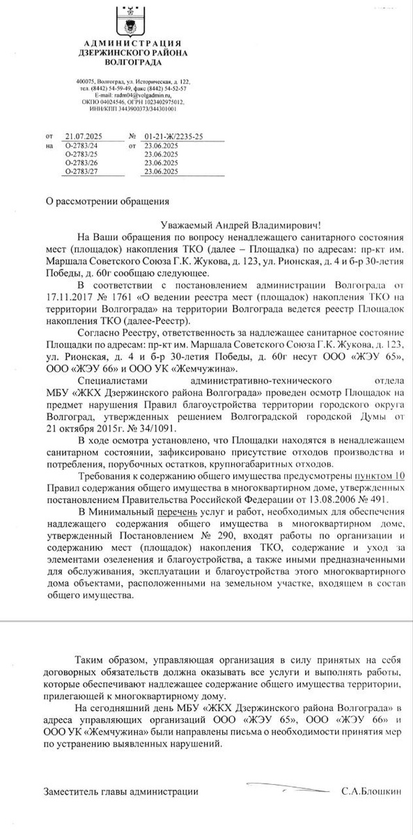 Публикуем ответ администрации Дзержинского района города Волгограда на обращение жителей Дзержинского района.