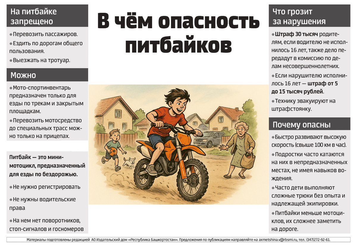 В этом году по вине гонщиков, которым не исполнилось 16 лет, произошли 24 аварии, двое детей погибли. Госавтоинспекторы республики бьют тревогу: такого количества малолетних водителей на наших дорогах еще никогда не было. — Питбайки, квадроциклы, электросамокаты, гироскутеры стали легкодоступными. Их просто приобрести, и на законодательном уровне на это нет запретов, — говорит старший инспектор Госавтоинспекции РБ майор полиции Линар Зиннуров. — Если раньше родители за хорошее поведение дарили детям игрушки, телефоны, то сейчас — двухколесные транспортные средства. По данным правоохранителей, в первом полугодии этого года водители до 16 лет стали участниками 56 ДТП, в них погибли двое несовершеннолетних, 53 получили травмы. В 11 происшествиях дети управляли автомобилями, в 24 — мототранспортом. 24 аварии произошли по вине малолетних водителей. Более тысячи юных гонщиков нарушили правила дорожного движения, 83 из них находились за рулем в нетрезвом состоянии. Езда на питбайках, мотоцикл