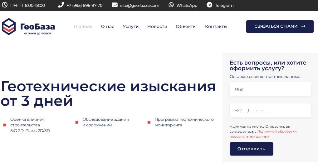 Заказчик обратился к нам с запросом на разработку современного сайта, который бы стал универсальным инструментом для: Главный упор был сделан на удобство пользователя, скорость загрузки, адаптивность интерфейса и SEO-оптимизацию сайта для выхода в топ поисковых систем. Безопасность пользователей была для нас приоритетом. Все формы защищены от спама и автоматических ботов. Сайт работает по протоколу HTTPS. Также мы реализовали кэширование страниц и оптимизацию изображений для обеспечения быстрой загрузки даже на мобильных сетях. Мы предусмотрели все необходимые инструменты для эффективного продвижения: Особое внимание мы уделили мобильной версии сайта. Так как многие заказчики услуг заходят с телефона, интерфейс адаптирован под любые экраны — от смартфонов до больших мониторов. Навигация упрощена, блоки сжаты до нужного минимума, а кнопки — увеличены для удобства нажатия. После запуска проекта сайт Geo-Baza.com: Проект Geo-Baza.com — это яркий пример функционального сайта, который решае