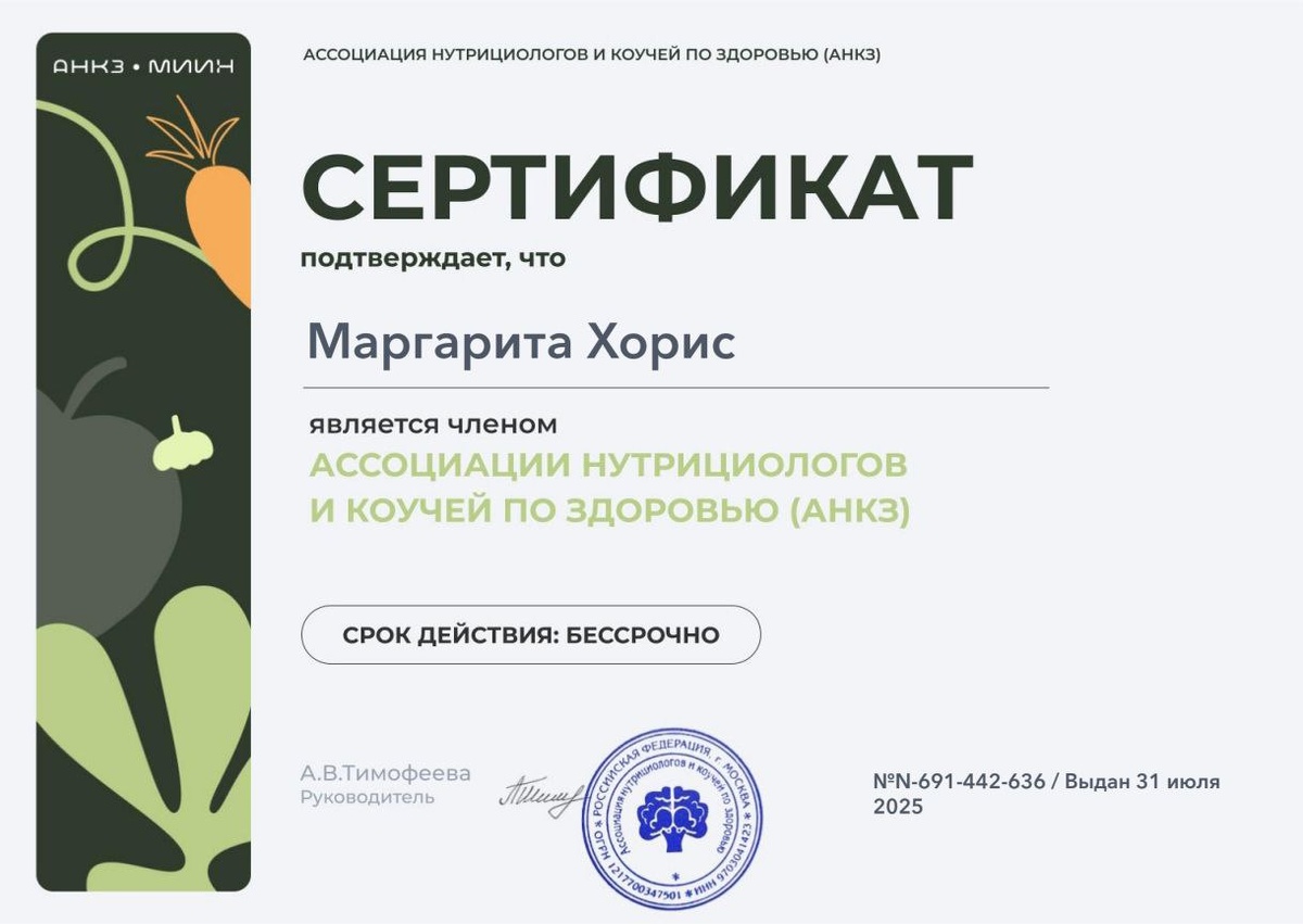 А вот и обновленный сертификат крупнейшей ассоциации нутрициологов и коучей по здоровью