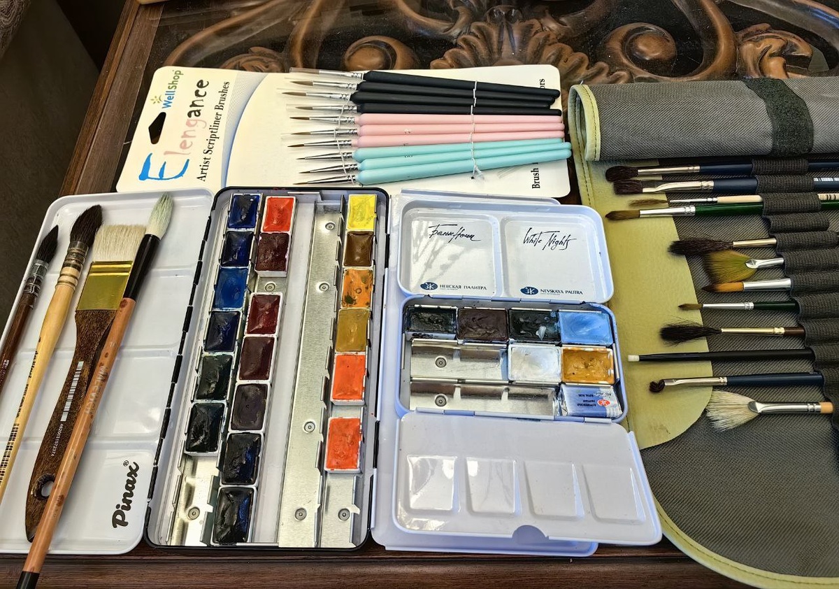 Поехала как- то в Санкт- Петербург без акварели , но там не устояла перед красотами города и напротив Академии Штиглица зашла в магазин и купила коробочку, пару кистей и много кювет , простаивает, так как дублирует первый набор.