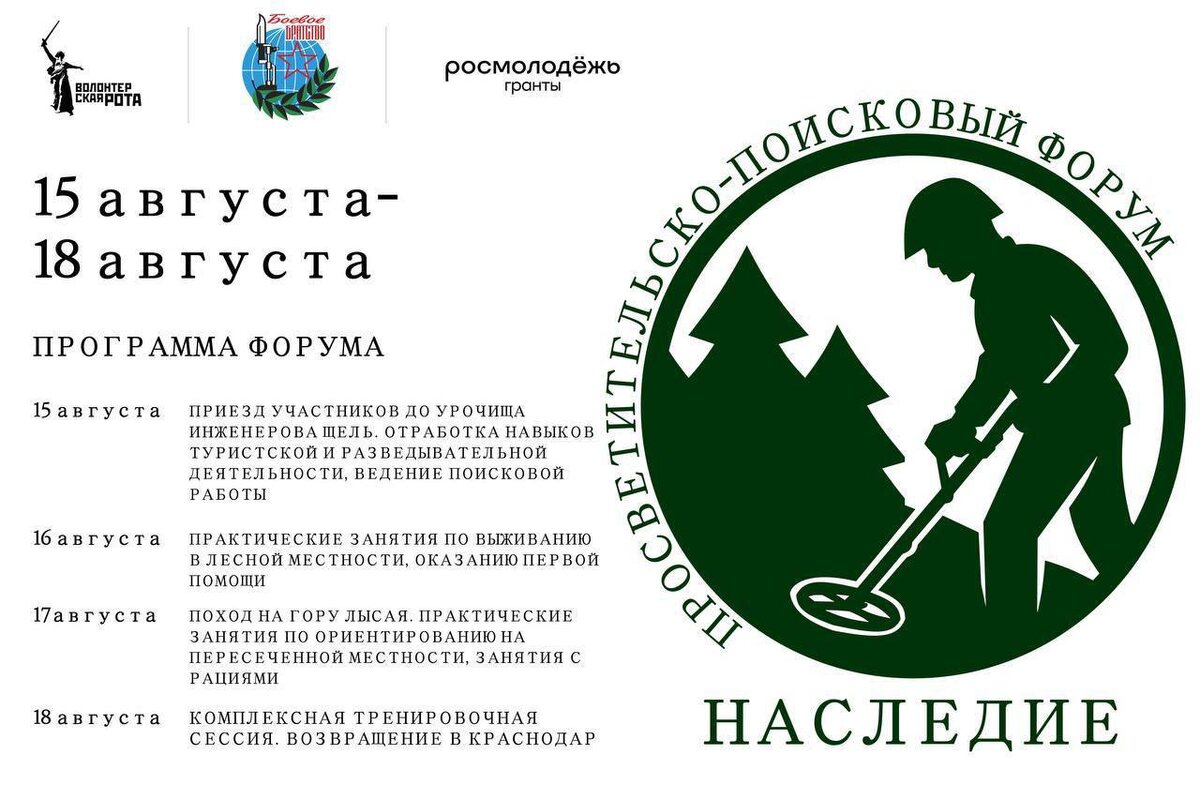 Приглашаем на форум "Наследие"! 🎖Хочешь прикоснуться к истории и почувствовать себя частью прошлого? Форум "Наследие" ждет тебя! Что тебя ждет: 🟢палаточный лагерь в горах; 🟢ориентирование, туризм; 🟢работа с рациями ; 🟢обучение по начальной военной подготовки от ветеранов боевых действий; 🟢поисковая работа 📍Живописная Инженерная щель близ Горячего Ключа, где шли бои 30-й Иркутской дивизии. ✅Будут отобраны 40 молодых людей в возрасте 18-35 лет, интересующиеся историей и поисковой работой. 🗓15-18 августа 2025 года Станьте частью удивительного наследия! 📝За дополнительной информацией и для регистрации обращайтесь @Leus_ru Реализуется с поддержкой Росмолодежь.Гранты 💜