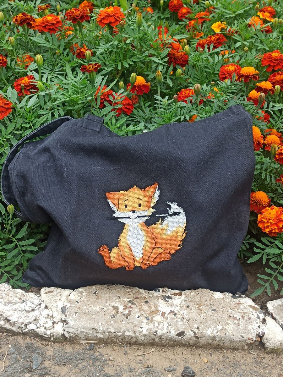 Я решила поделиться в своей группе в ВКонтакте процессом вышивки лисенка на сумке. В посте я упомянула автора схемы, и она увидела публикацию. Мы начали обсуждать скриншот из «Саги», и выяснилось, что Сага допустила ошибку в сложении нитей, а автор схемы не перепроверила работу. Оказалось, что вся вышивка должна быть выполнена в два сложения нитей. Эта информация помогла мне продолжить работу с чистой совестью.