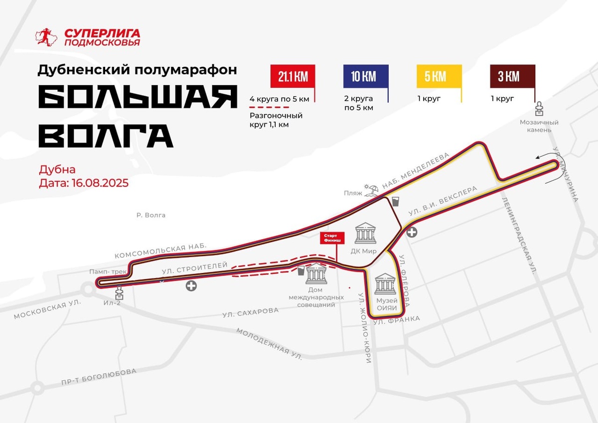 Так, в связи с проведением 16 августа Дубненского полумарафона «Большая Волга» 2025 в рамках серии легкоатлетических забегов «Суперлиги Подмосковья», с 07:00 до 16:00 будет прекращено движение транспортных средств по следующим улицам: