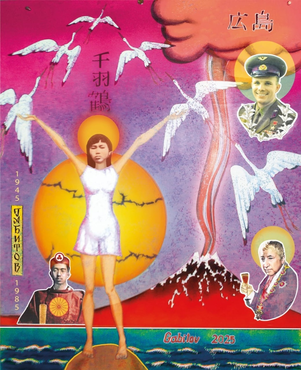 Прошло ещё 40 лет… Уже прославленный и маститый художник Роберт Габитов (лауреат многих престижных международных конкурсов, чьи уникальные работы хранятся в коллекциях многих известных людей мира, в том числе королевы Великобритании Елизаветы II) вновь вернулся к, казалось бы, слегка подзабытой теме. Ведь сейчас, как никогда, после американской бомбардировки ядерных объектов в Иране мир снова встал на тонкую грань термоядерной катастрофы. В своей новой картине - артефакте с элементами коллажа в цвете художник отразил сегодняшний день. Грустная девочка Садако, вскинув руки на фоне треснувшегося Солнца, словно Богиня Аматэрасу - прародительница японских императоров, встречает и провожает бесконечные клины летящих журавлей. Она словно кричит и молит людей: «Люди, остановите смерть, остановите войны и любите друг друга, ведь жизнь так бесценна и прекрасна!»