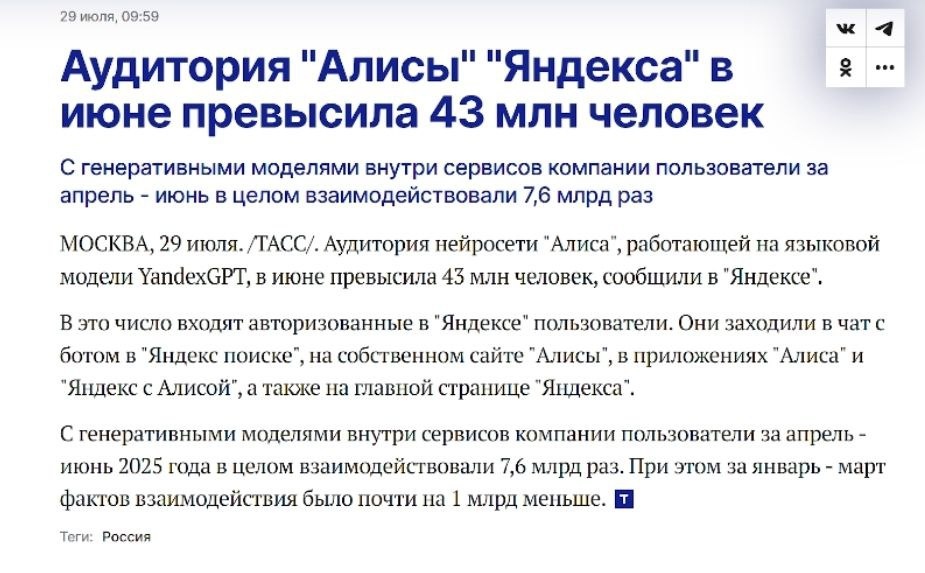 Что вообще происходит с этим ИИ на рынке? Коротко: ИИ давно перестал быть «прикольной штукой». Он становится навыком. Таким же, как Excel когда-то. Только быстрее, мощнее — и без милосердия к тем, кто тормозит. Вот свежак: 📍43 миллиона человек за июнь использовали Алису с нейросетями. Это только в Яндексе, в поиске, чате и приложении. И знаете, кто использовал? Да, обычные люди. Для своих простых запросов. 📍7,6 миллиарда взаимодействий с нейросетями — +1 млрд к прошлому кварталу. Рост бешеный. ИИ встроен в продукты, обучение, работу с клиентами, маркетинг и даже HR. И если вам всё ещё кажется, что это не про вас…не заблуждайтесь, ребята. ИИ везде и те, кто будут уметь применять правильно этот “навык” будут востребованными специалистами и не отстанут от жизни. У меня есть просто обалденный курс. 💥 Реально. 5-дневный БЕСПЛАТНЫЙ курс “Нейропрорыв” — чтобы вы сами руками попробовали, как это работает. Зайдите, посмотрите и расскажите мне потом, как оно вам? Знать больше и уметь б