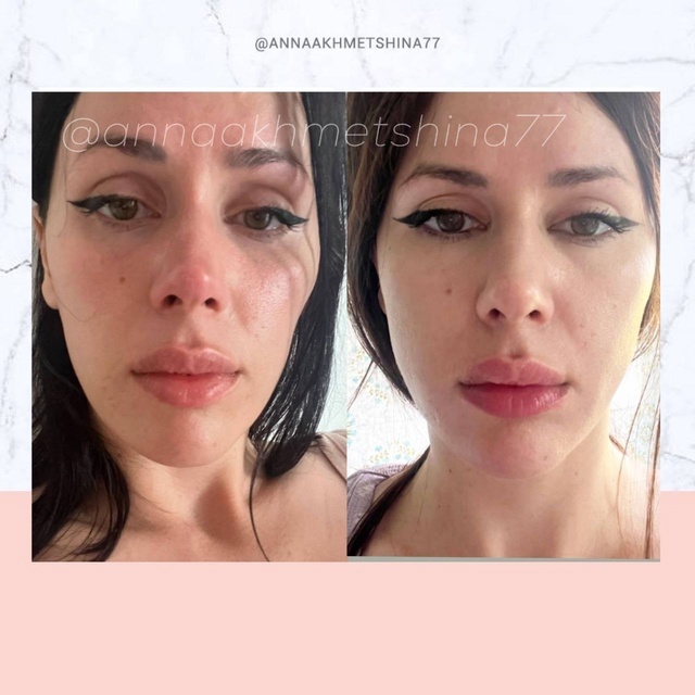 Теперь все изменилось, лицо снова обрело молодые гладкие черты, ушла рубленность, вернулись щечки, наполнилось под глазами, форма глаз вытянулась к вискам (за счет расширения верхней и средней трети), а также ушла десневая улыбка (на фото Инесс улыбается совсем слегка, но видно, что губа "до" поднимается выше, причём сама форма губы тоже улучшилась, завернулась.