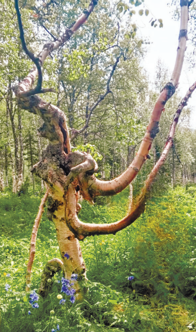 Мы остановились как раз на той туристической стоянке, откуда начинается пешая часть маршрута. До озёр ведёт живописная тропка, по которой встречаются удивительные берёзы, получившие за извилистую форму порочащее название – пьяные. Да и вправду, кажется, они не могут стоять ровно. Причина тому – обильные снегопады. Снег прижимает тонкие и гибкие молодые стволы к земле, а после таяния деревья не способны полностью выпрямиться и остаются изогнутыми. Берёзам дали и другое название, более ласковое – танцующие. Также встречаются небольшие заболоченные озёра, словно из сказки об Алёнушке. На полянах набирает цвет иван-чай. Луга пестрят оранжевыми огоньками и синими водосборами. Их такое множество: насмотрелась за день, что перед сном они так и стояли во всей красе перед глазами.