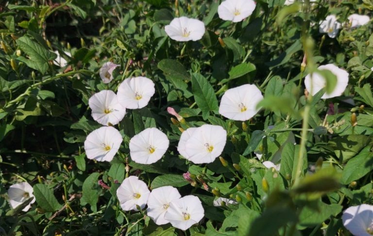 Белый вьюнок или «березка» — один из самых злобных сорняков. Он заполняет участок, обвивает растения, душит их. Многие просто выдёргивают плети, но это бесполезно. Как же с ним справиться? Как говорят специалисты: «Ваши главные союзники в борьбе с вьюнком — терпение и настойчивость». Почему не работает простое выдергивание сорняка. Дело в том, что его корни уходят в глубину на 2-3 метра, поэтому удалить его просто невозможно, а из обрывков корней вырастают новые побеги. Через 2-3 недели вьюнок отрастает ещё гуще, и проблема усугубляется в разы. Поэтому нужно применять только глубокую перекопку на штык лопаты с тщательной выборкой корней. Второй метод, так называемое удушение светонепроницаемыми материалами. Сорняк скашивают и застилают участок плотной черной пленкой, агроволокном, линолеумом или рубероидом на полный сезон. Без света фотосинтез невозможен. Корни растения постепенно истощаются и погибают. Эффективность — 85-95% за один сезон. Можно истощить вьюнов регулярным скашиванием.