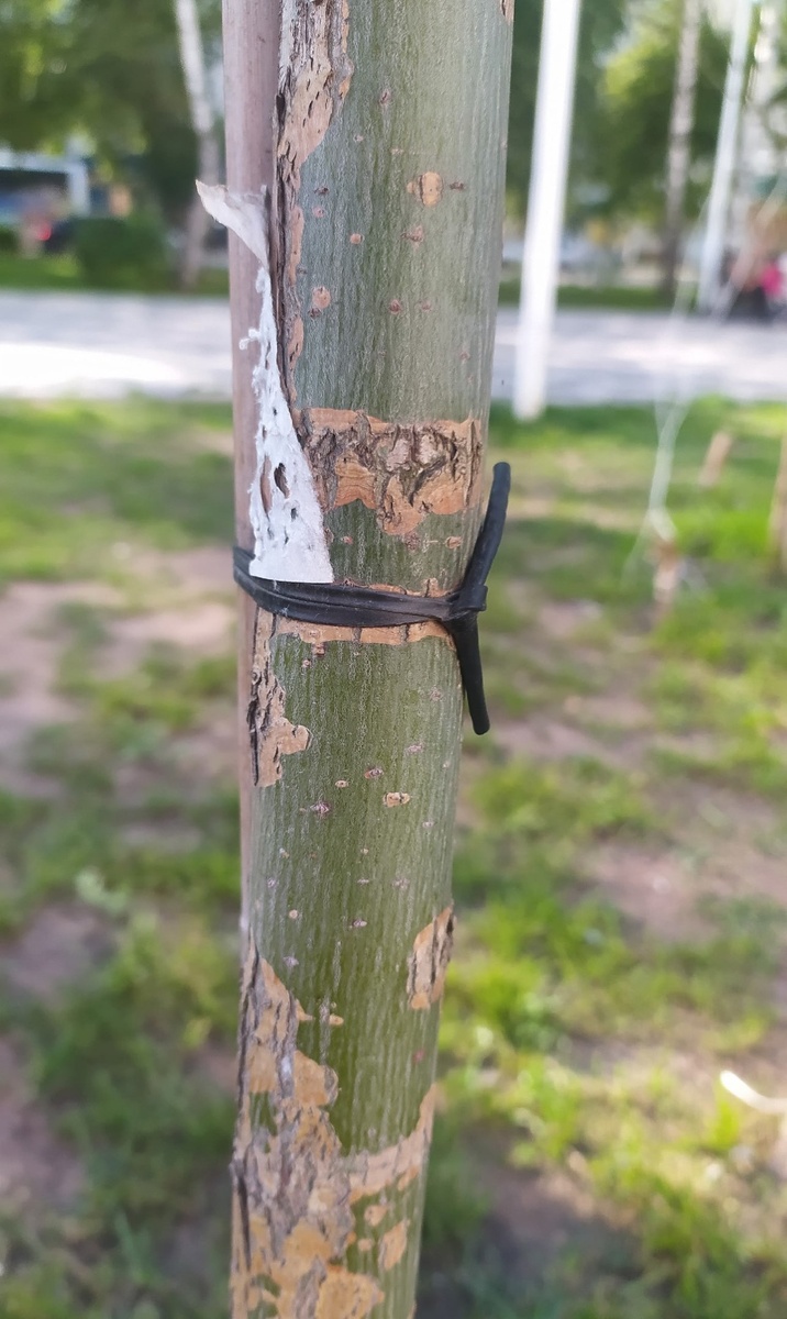 Подскажите к кому обратиться. На новой алее по пр. Юбилейной высажены красивые деревья, но уже несколько месяцев смотреть больно. Все они перетянуты стяжками. Деревья растут, а хомуты уже впились в стволы. Нужно или расслабить или снять.