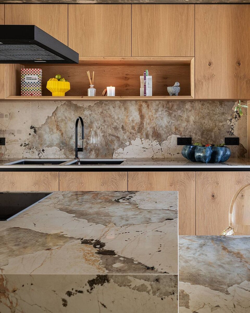 На эффектной кухне Dekton - Khalo плавно переходит от кухонного фартука к острову и столешнице.✨ Сочетание черного, бледно-золотого и кофейно-коричневого цветов прекрасно сочетается с дубовыми шкафами, создавая эффектное и удобное пространство для приготовления пищи. Больше информации вы найдёте на нашем официальном сайте.