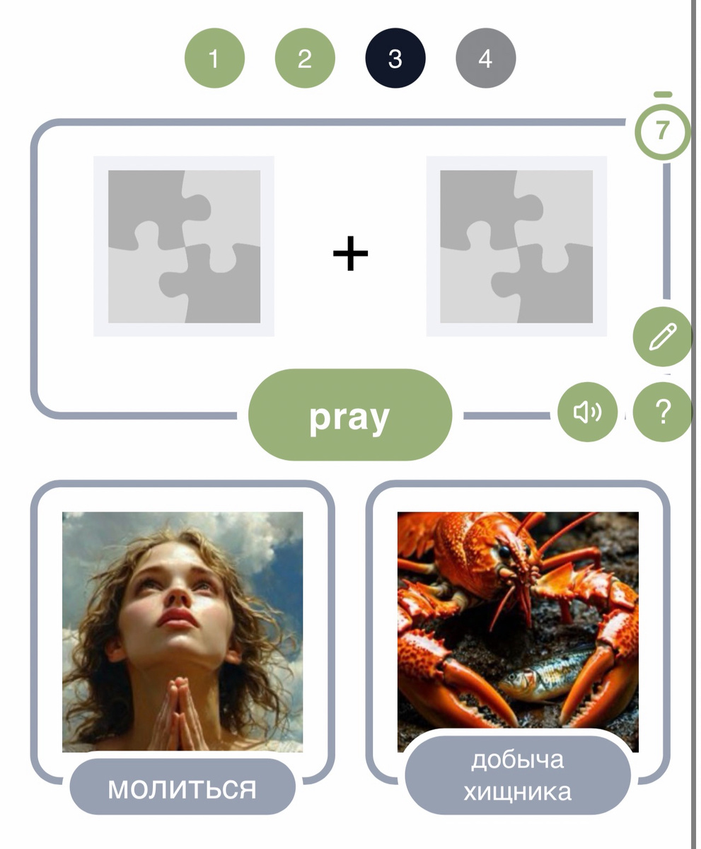 При таком подходе, на мой взгляд, английское слово «prey» («добыча») идеально встает в пару к слову «pray». Вот какое изображения получились у нейросети тренажера Parrylingo (ссылка на него в конце статьи) для урока с этими двумя словами. «Добычу», правда, на картинке справа не очень заметно, но, тем не менее, красный лобстер - это хищник (он показан для контекста), а маленькая рыбка в его клешнях - это его добыча - «prey».