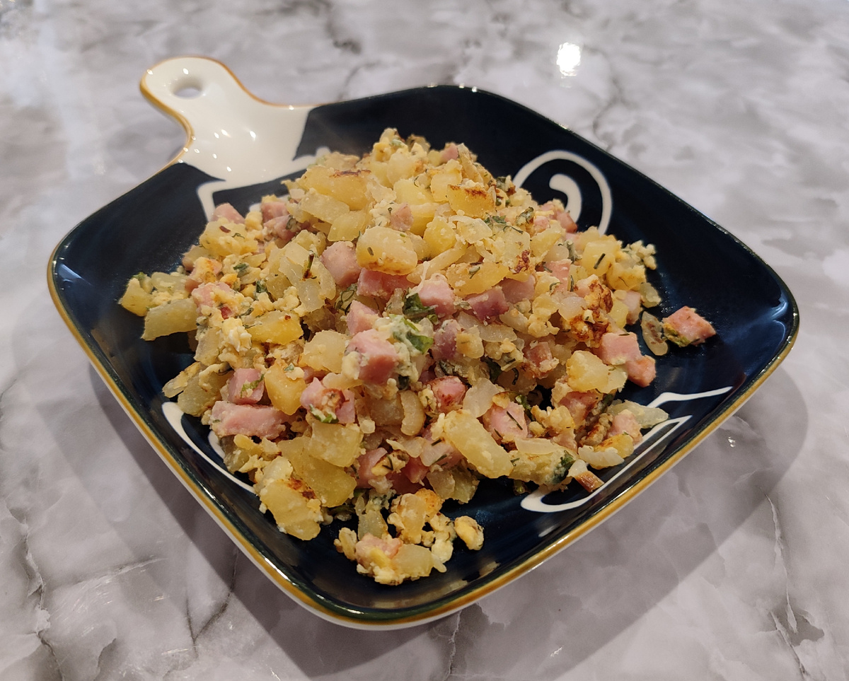 Это была сложная и сытная яичница, приготовленная на минимальном количестве горчичного масла и состоящая из одной средней отварной картофелины, половины средней луковицы, четырех ломтиков малокалорийной ветчины, двух яиц, щепотки адыгейской соли и зелени.