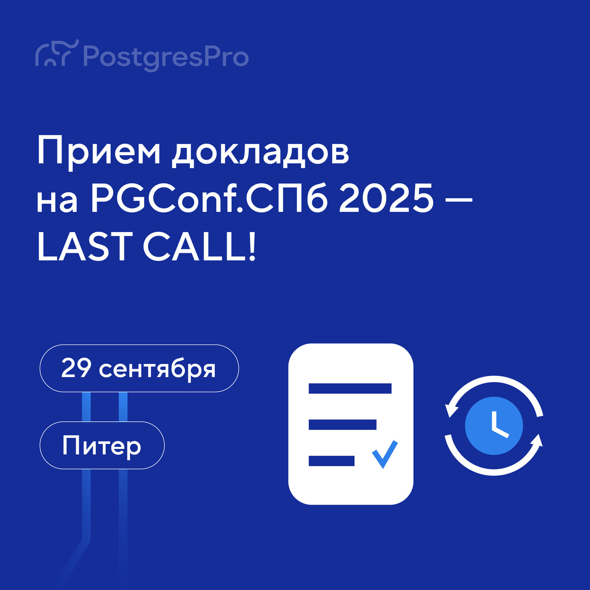 До 1 августа принимаем заявки на доклады на масштабную конференцию по PostgreSQL. Если хотели выступить, но еще не отправили тему и тезисы — самое время это сделать! ➡️Выступление на конференции — возможность поделиться опытом, познакомиться со специалистами, разобрать сложные рабочие задачи. Подавайте заявку на сайте. Докладчики участвуют в PGConf.СПб 2025 бесплатно, а если вы не из Санкт-Петербурга — мы организуем трансфер и оплатим отель на время проведения конференции. 🔥На конференции участников ждут 20+ докладов, 5+ демонстраций решений на базе PostgreSQL и Postgres Pro, а также мастер-классы и профессиональная сертификация (запись — отдельная). 📍PGConf.СПб 2025 пройдет 29 сентября в Санкт-Петербурге: гостиница «Санкт-Петербург», Пироговская набережная, д. 5/2, также участвовать можно онлайн. До 15 августа — самая выгодная цена на билет. Регистрация на PGConf.СПб 2025