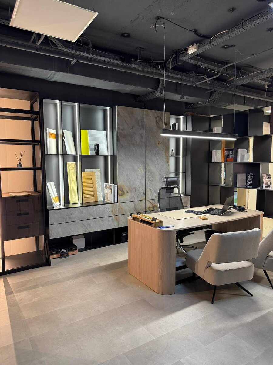 Функциональная офисная мебель с отделкой из натурального камня: такой приём особенно хорошо работает в кабинетах, зонах ресепшн, переговорных – там, где хочется выразительности без декоративного шума.