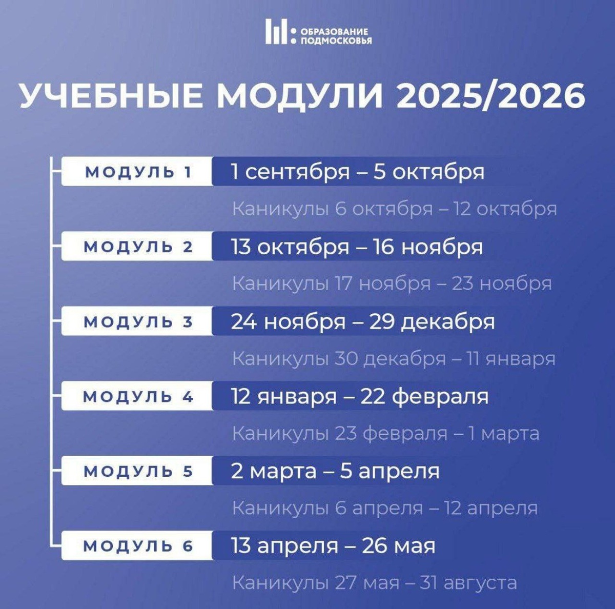 ❗️Министерство образования Подмосковья опубликовало график учебных модулей и каникул на 2025/2026 год.