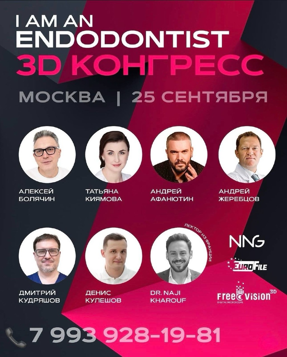 🔥🔥🔥ПЕРВЫЙ ЭНДО 3D КОНГРЕСС🔥🔥🔥 25 сентября в МОСКВЕ состоится грандиозное событие для всех стоматологов! I am an ENDODONTIST 3D КОНГРЕСС это: • Передовые технологии в эндодонтии • Практические знания от топовых экспертов • Разбор реальных клинических случаев ⚡️ Наши спикеры: Prof. Dr. Naji Kharouf Андрей Афанютин Татьяна Киямова Денис Кулешов Алексей Болячин Андрей Жеребцов Дмитрий Кудряшов 🪄 Что вас ждёт: ▫️Клинические рекомендации по повторному лечению ▫️Секреты эргономики рабочего места ▫️Инструментальная диагностика осложнений ▫️Профилактика ошибок при первичном лечении ▫️Разбор сложных случаев Особый акцент на: ▫️3D-технологии в эндодонтии Анализ типичных ошибок ▫️Границы возможного в современной эндодонтии Не упустите шанс повысить свою квалификацию и обменяться опытом с коллегами! Регистрация: +7 993 928-19-81 Мероприятие пройдет при поддержке компании @Eurofileru 🔝 #nng #3d #endo #endodontist #эндодонтия #обучениестоматологов #ошибкииосложнения #эндодонтическоелеч