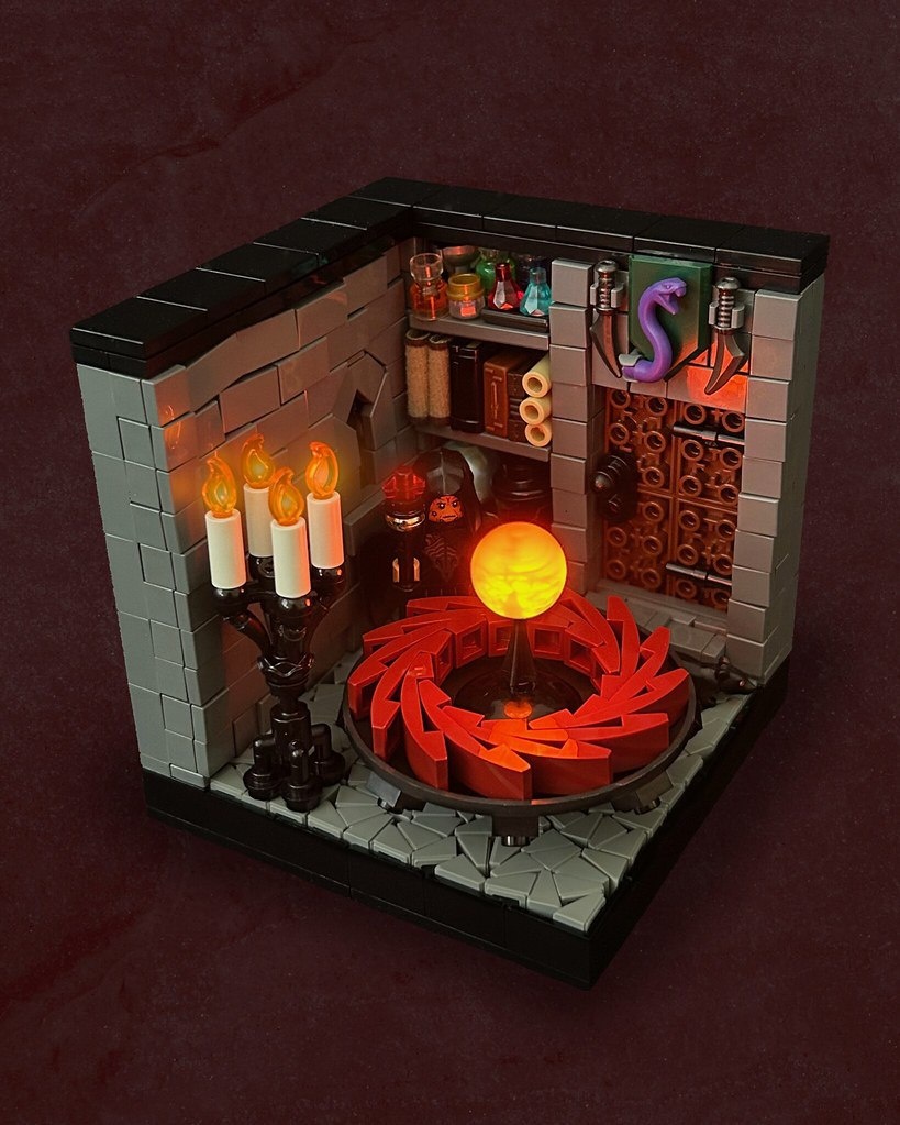 Взгляните на эту сцену от Джоэла Шорта — здесь всё не так, как кажется! Пол собран из боком поставленных сырных склонов, имитирующих грубый камень, а сам бассейн — это арки, уложенные особым способом. Минимум деталей, максимум магии! LEGO снова доказывает: правила созданы, чтобы их нарушать.