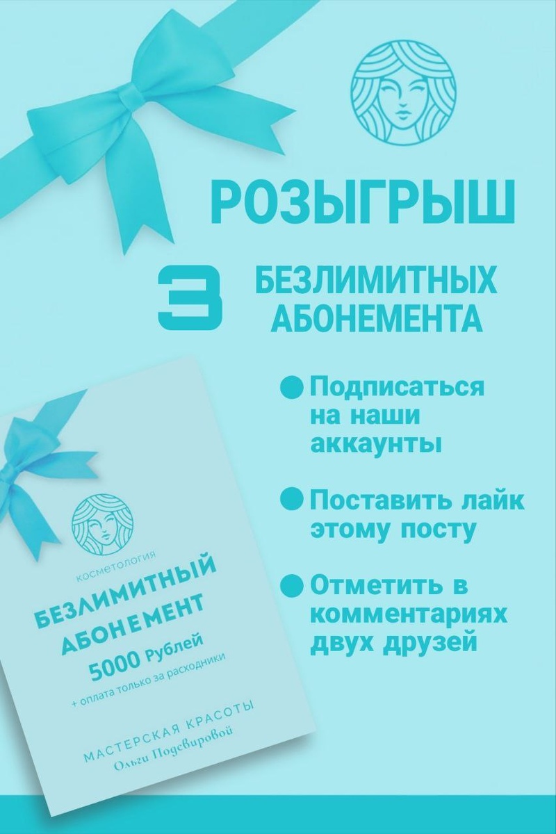 🎀 РОЗЫГРЫШ! 🎀 Хочешь месяц ухода и красоты — почти бесплатно? Мы дарим 3 безлимитных абонемента на процедуры эстетической косметологии — номиналом 5 000 ₽ каждый! Ты получаешь целый месяц процедур, оплачивая только себестоимость материалов 💆♀️✨ 📍Чтобы участвовать: 🔹 Перейди в наш Instagram 🔹 Подпишись, поставь лайк и отметь 2 подруг под постом — всё просто! 📅 Итоги подведём 11 августа в сторис 👉 Жми и участвуй