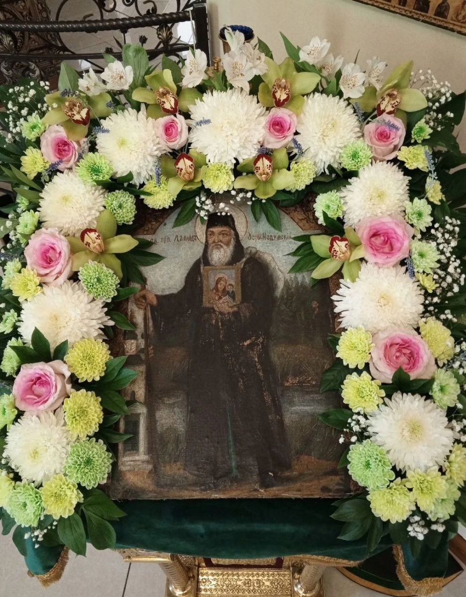 Настоятель храма архимандрит Владимир (Дяченко) благодарит храмового флориста Дину Кротову за красивое оформление храма к торжеству преподобного Леонида Устьнедумского.