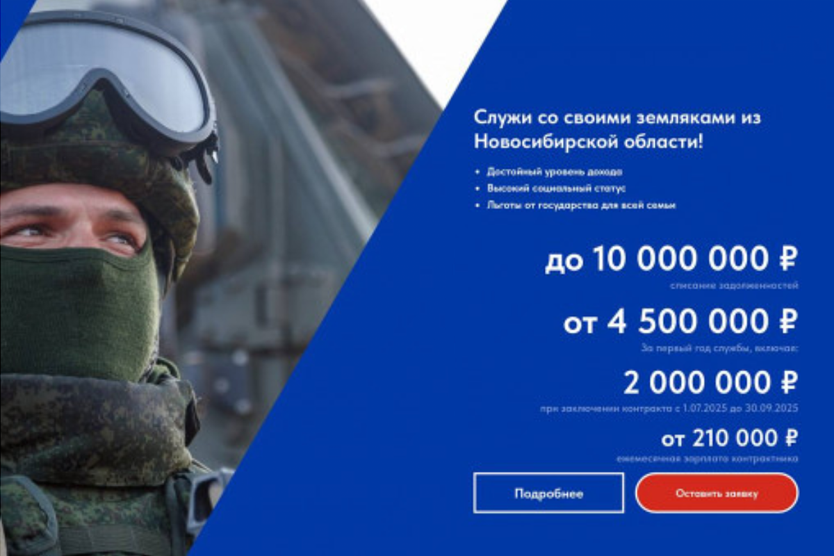 Единовременно новоиспеченный военнослужащий получает 2 млн рублей. Зарплата начинается от 210 тысяч, а за достижения на фронте положены дополнительные выплаты. В Новосибирской области до 30 сентября действуют повышенные выплаты за заключение контракта на военную службу. Региональная выплата составляет 1,6 млн рублей, федеральная — 400 тысяч. Соответствующее решение приняли губернатор Андрей Травников и региональное правительство. В пунктах отбора добровольцам расскажут об особенностях службы, выплатах и социальных гарантиях. Далее добровольцы пройдут профориентацию и медицинское обследование, проверку личных данных. После заключения контракта бойцы отправляются в воинские части, где проходят интенсивную подготовку. Военнослужащим доступны меры поддержки: кредитные и налоговые каникулы, бюджетные места для детей в вузах, бесплатный отдых для детей, бесплатные лечение и реабилитация, а также статус ветерана боевых действий, для которого действуют свои льготы. Также возможно аннулирование