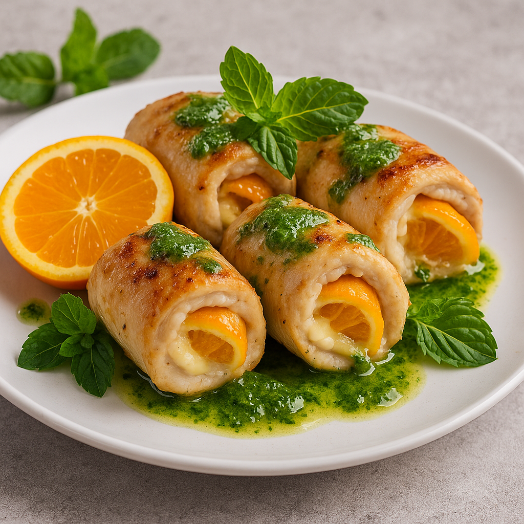 Авторский рецепт: Сырно-цитрусовые рулетики с курицей и мятным соусом 🍗🍊🌿