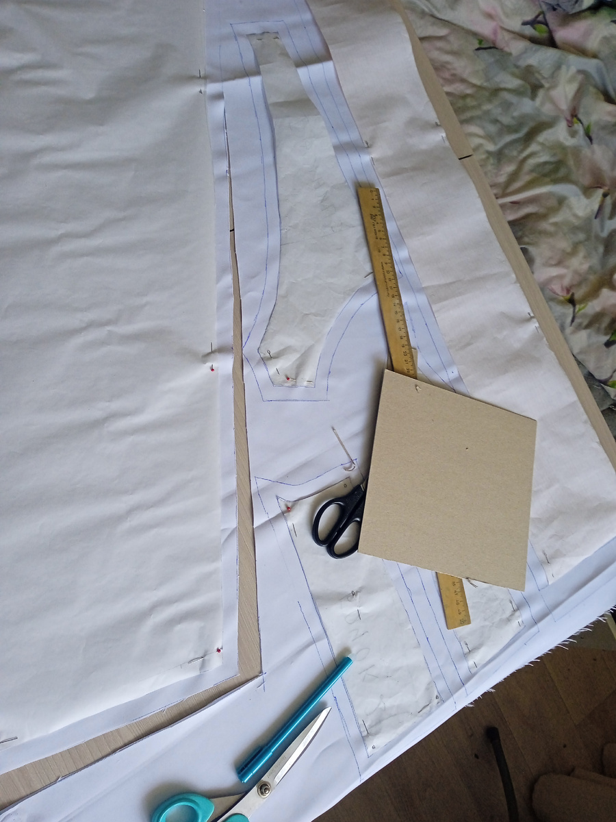 Выкройка и макет уже проверенные. Я поменяла только вырез, сделав ему немного другую форму. Всё остальное оставила так, как было. С раскроем тоже всё стандартно. Свадебный атлас оказался не сильно капризный. Даже сыпется не катастрофично. Припуск оставляла везде по полтора сантиметра. На горловине можно делать меньше, но мне удобнее везде сделать одинаковые и потом, если лишнее, можно срезать.