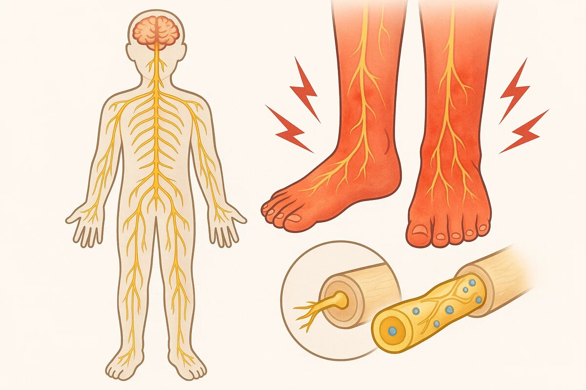 Полиневропатия — это не отдельное заболевание, а синдром, который может иметь множество причин. Одна из самых частых — сахарный диабет. Избыток глюкозы и проблемы с микрососудами приводят к хроническому повреждению нервов.