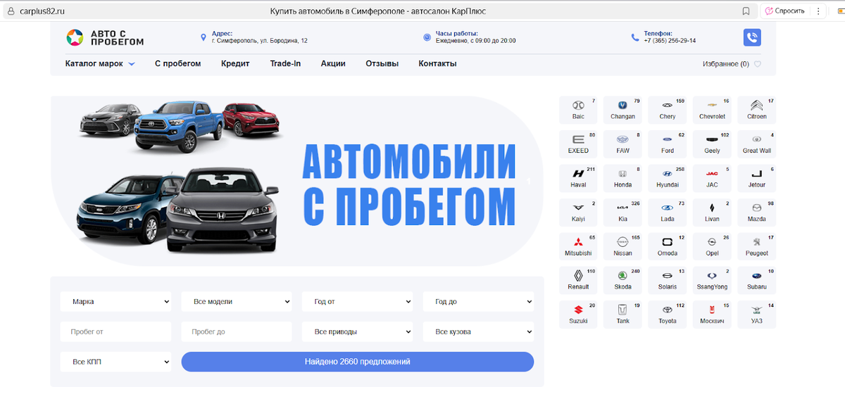 Кар Плюс — это автосалон в Симферополе. Вероятнее всего, является лендингом для сбора заявок. Напрямую связан сразу с несколькими дилерами из нашего черного списка. Больше подробностей — в нашем обзоре.