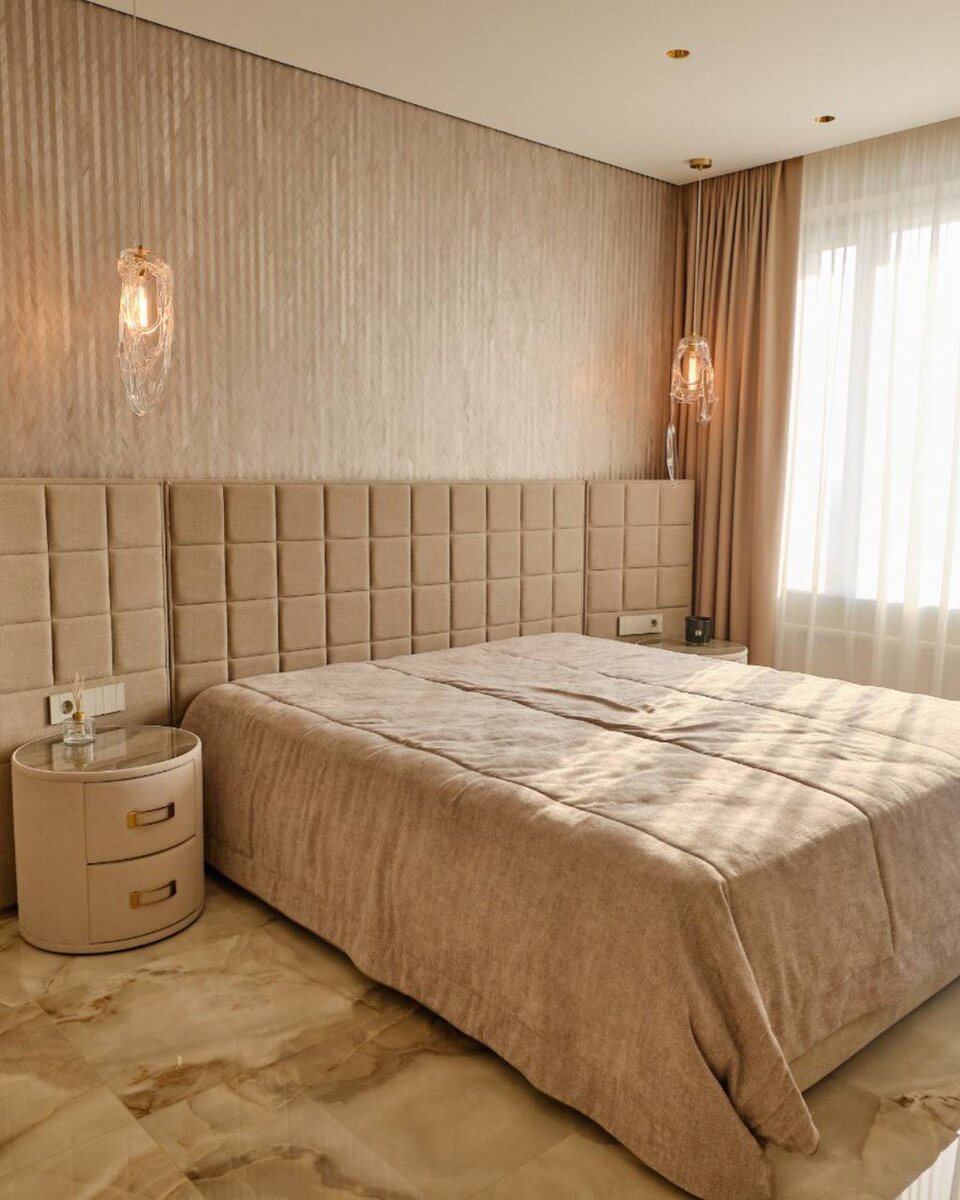 Идеальное сочетание дизайна и функциональности Проект мастер-спальни и гардероба в ЖК «Дежнев» — это ода гармонии и искусству. Вдохновляясь естественными материалами и тонкостью исполнения, мы создали пространство, где каждый элемент говорит о заботе и внимании к деталям. Фактурные стены, мягкое изголовье ручной работы и изящные хрустальные подвесы — всё дополняет атмосферу спокойствия и уюта. С рассветом мягкий свет проникает сквозь ткани, наполняя комнату теплом и гармонией. Гардеробная зона — сердце проекта: зеркальные фасады, отделка из благородных материалов и деликатные системы хранения создают не только порядок, но и визуальное великолепие. Тактильные поверхности, строгие формы и минимализм подчеркивают статус и стиль владельца. Всё создано для того, чтобы утро начиналось с гармонии, а вечер — в благородной тишине. Прикоснитесь к дизайну класса А — портфолио реализованных проектов на сайте magentastudio.ru Обои - натуральный шпон DECARO Спальный гарнитур - Milano home Конц