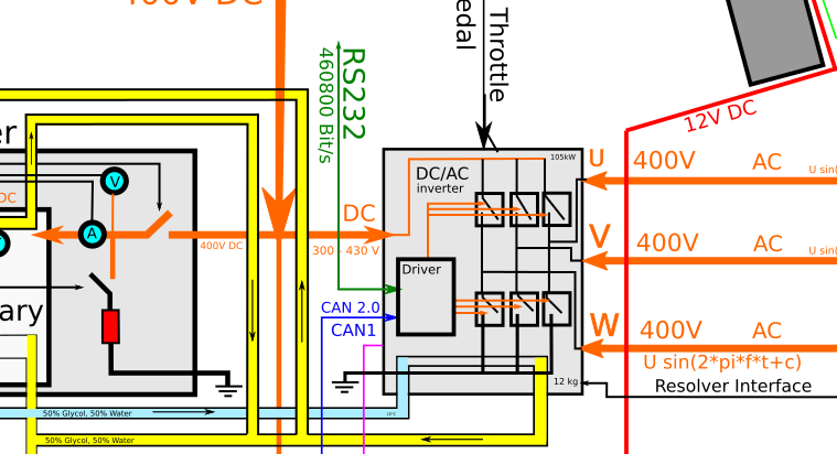 К контроллеру инвертора подключена педаль газа. Если все CAN устройства зависнут, то автомобиль хоть как-то сможет ездить. Для вращения в электромобилях используют асинхронный электродвигатель. Он работает от переменного тока. Угловая скорость определяется частотой синусов в фазах тех трех силовых оранжевых проводах, что подключены к индукционному мотору. Обычно рядом с мотором прямо на его оси прикреплен механический редуктор. Редуктор нужен для увеличения крутящего момента на колесах. Также на оси электродвигателя есть датчик положения вала (Резольвер или СКВТ). Он сообщает инвертору, что двигате