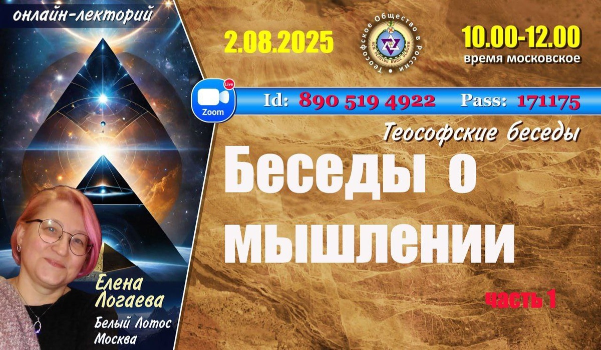 🔥🔥🔥 Дорогие друзья! Этим летом на нашем лектории будут проходить ТЕОСОФСКИЕ БЕСЕДЫ. В ближайшую субботу приглашаем вас принять участие в "Беседах о мышлении" (Часть 1) 👩🎓Ведущая: Елена Алексеевна Логаева, Отделение "Белый Лотос", г.Москва. 🔔 ДАТА: суббота, 2 августа 2025 г. Начало в 10:00 (время московское). ⏺️⏺️⏺️Вход в ZOOM: www.zoom.us Id: 890 519 4922 Pass: 171175 ⚡️Быстрый вход в лекторий по ссылке: https://clck.ru/37Q6hC 👉Предварительная регистрация и установка программ - не нужны. Участие - бесплатное. Включение вашей персональной камеры - не требуется. ‼️Все вопросы вы можете направить по адресу: secretary@ts-russia.org ☀️Добро пожаловать!
