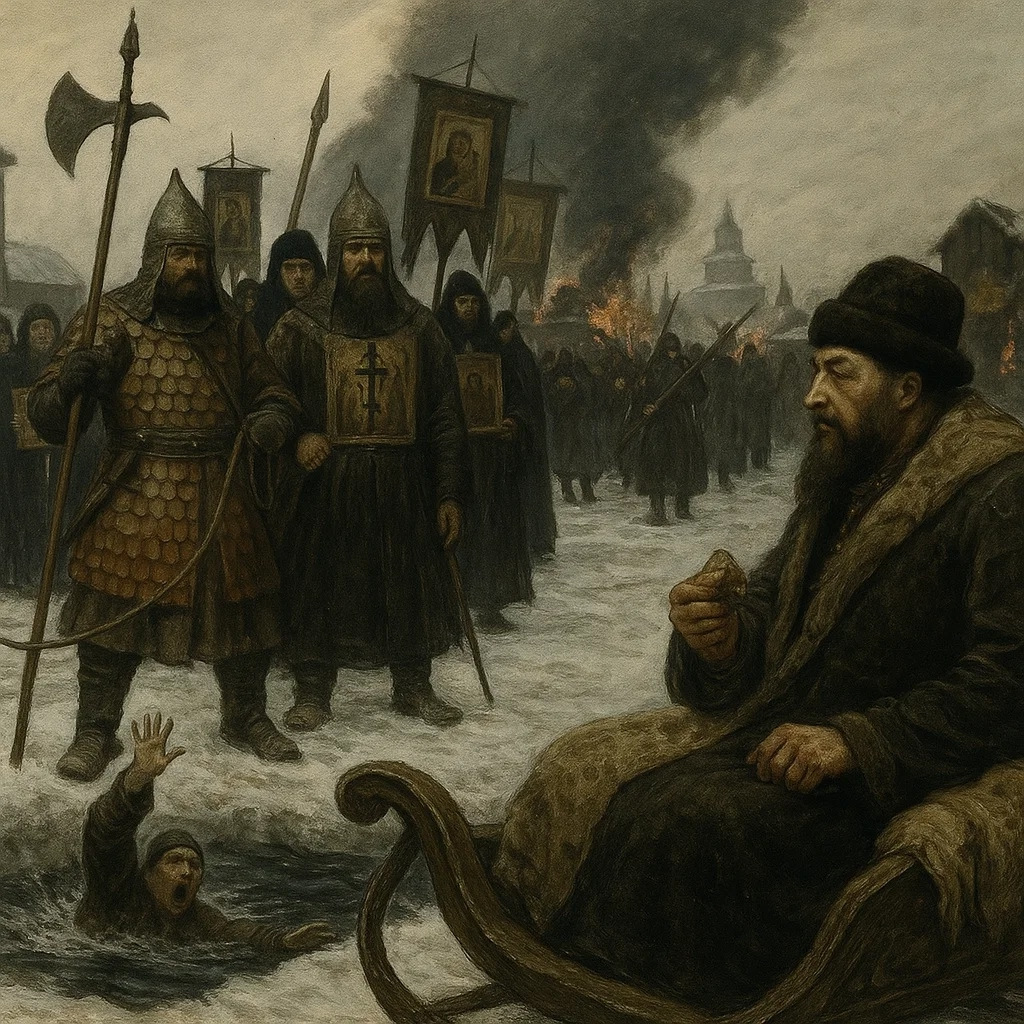 Летом 1570 года по улицам Новгорода шли монахи в чёрных рясах, неся иконы и хоругви. За ними — стрельцы в чешуйчатых доспехах, с топорами и петлями. Это был не крестный ход. Это была опричнина. Иван Грозный приехал в Новгород не с поклоном. Его привело подозрение — мол, местные бояре собирались перейти под руку Литвы. Доказательств не было, но зачем они, если есть страх? Царь поселился в Юрьевом монастыре под городом. Каждый день оттуда в Новгород выходили отряды. Стрельцы хватали купцов, священников, вдов. Одних бросали в реку с привязанными брусьями, других — пороли и сажали на кол. По разным оценкам, за несколько недель погибли тысячи. Говорят, одну из казней смотрел сам царь — сидел на санях и ел. Перед ним бросали в прорубь целые семьи. Говорят — не отводил глаз. Когда резня закончилась, на месте крупных домов пустовали угли. Новгородское вече давно молчало, теперь замолчали и улицы. Что это было? Месть? Профилактика? Показательная расправа? Современники так и не поняли. А историк