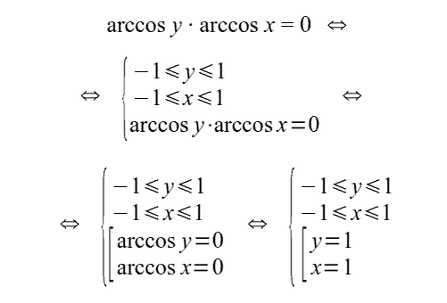 Функция арккосинуса определена для аргумента, принимающего значения от –1 до 1, а произведение равно нулю, если хотя бы один из множителей равен нулю. В учётом сказанного выполним с заданным в условии уравнением равносильные преобразования: