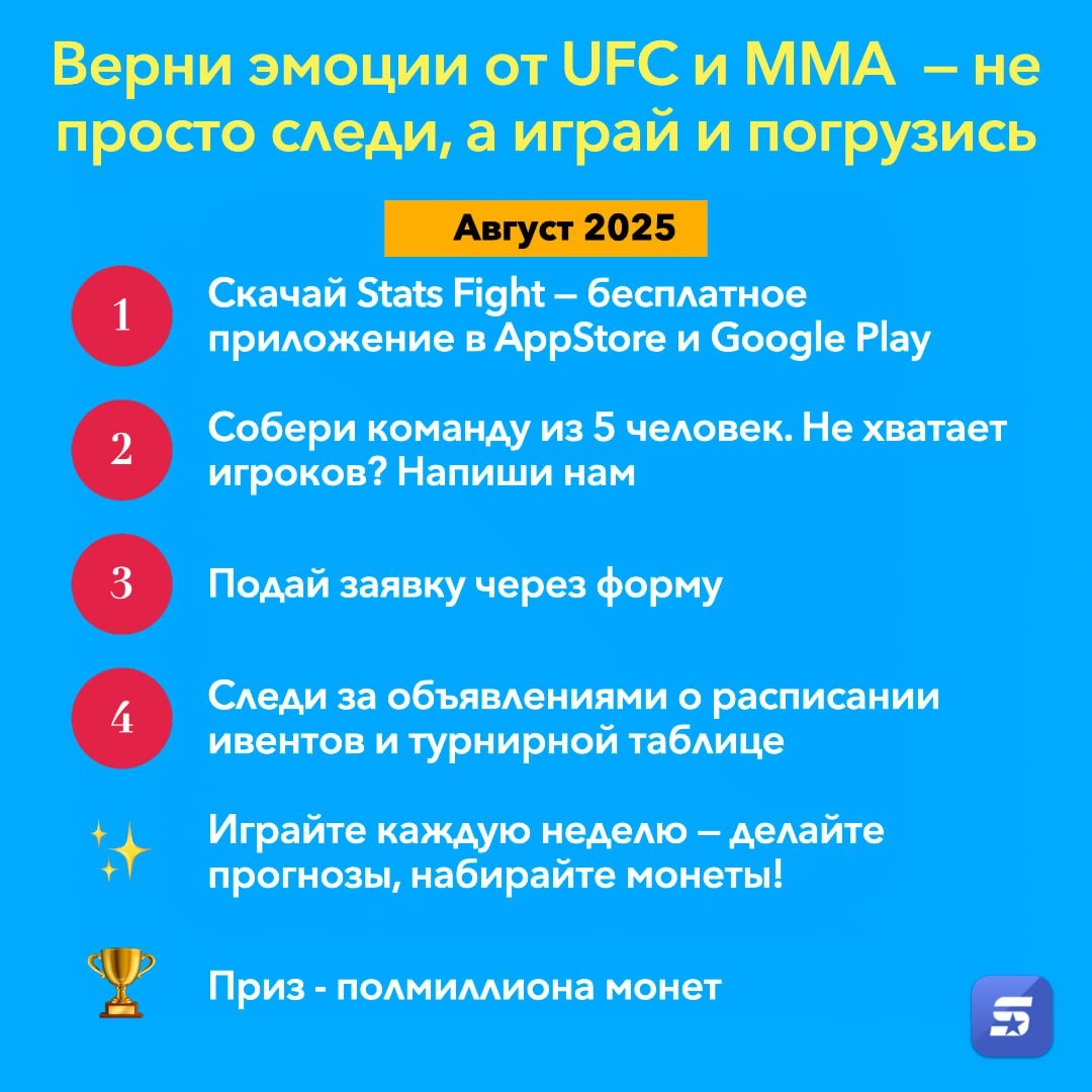 🎮 Верни эмоции от UFC и ММА — не просто следи за ним, а играй и погрузись в него. Завтра в пятницу с PFL стартует командный турнир августа в Stats Fight — играй в команде с друзьями и фанатами. 👇 Вот как попасть в игру: 1️⃣ Скачай Stats Fight — бесплатное приложение: 📱 AppStore 📱 Google Play 2️⃣ Собери команду из 5 человек. Не хватает игроков? Напиши нам — найдём тебе бойцов в пятёрку 💬 3️⃣ Подай заявку на участие: 📝 Заполнить форму 4️⃣ Следи за обновлениями: 📅 Каждую пятницу — расписание ивентов 📊 Каждое воскресенье — текущая турнирная таблица 5️⃣ Играй каждую неделю: ⚔️ Делай прогнозы, набирай монеты, применяй карточки. 🏆 Приз — полмиллиона монет, которые заберут победители ✨ + каждому участнику — золотая карточка бойца UFC 320