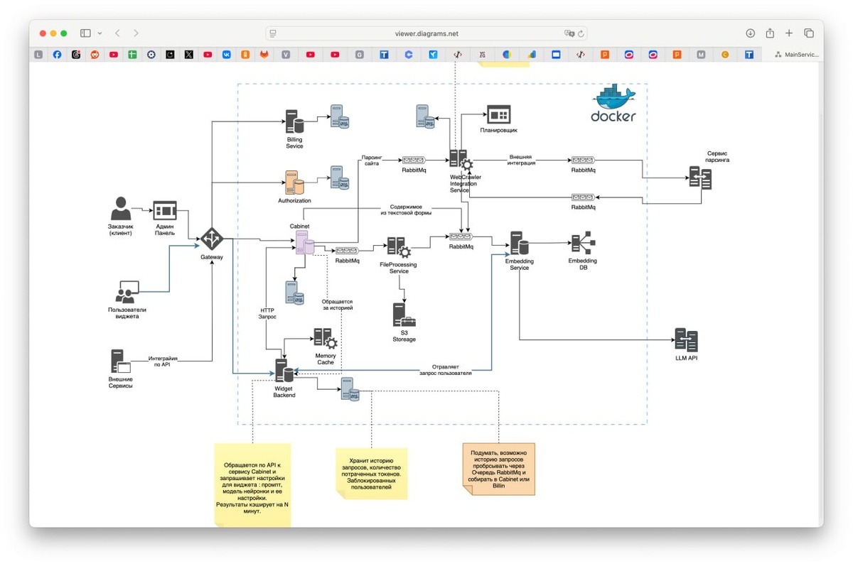 На картинке архитектура RAG- системы, которую мы делаем... Другими словами - это умный ИИ- помощник (агент, чат) на вашем сайте, который отвечает по базе знаний... Как обычно - мы думали все будет чуть проще, а оказалось сильно сложнее. И дело не в ИИ, а в некой "обвязке" вокруг. Секретов нет, есть просто монотонная работа, скучная и не очень креативная :) С февраля возимся, надеюсь к февралю 2026 года и запустимся... Стек: .net core, embending, mariadb, rbbitmq и по мелочи, а сам сайт (продающий) на WordPress. Русский ИТ бизнес